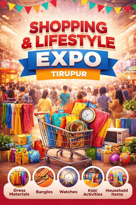 Explore a vibrant shopping experience at the Grand Shopping & Lifestyle Expo in Coimbatore, bringing together a wide range of products and entertainment under one roof. This expo features an exciting collection of dress materials, bangles, watches, men’s fashion, and household products. It is the perfect place to shop for the latest trends, discover unique items, and enjoy a lively exhibition atmosphere. Families can also enjoy dedicated kids’ entertainment zones, making it a fun outing for all age groups. Whether you are looking to shop, explore, or spend quality time with your family, this expo offers something for everyone. Highlights: Wide range of dress materials and fashion accessories Bangles, watches, and men’s fashion collections Household products and essentials Kids entertainment and family-friendly activities Multiple stalls and exhibitors Shopping expo in Tiruppur for dress materials and household items Open for all age groups. Ideal for families, shoppers, and exhibition lovers.